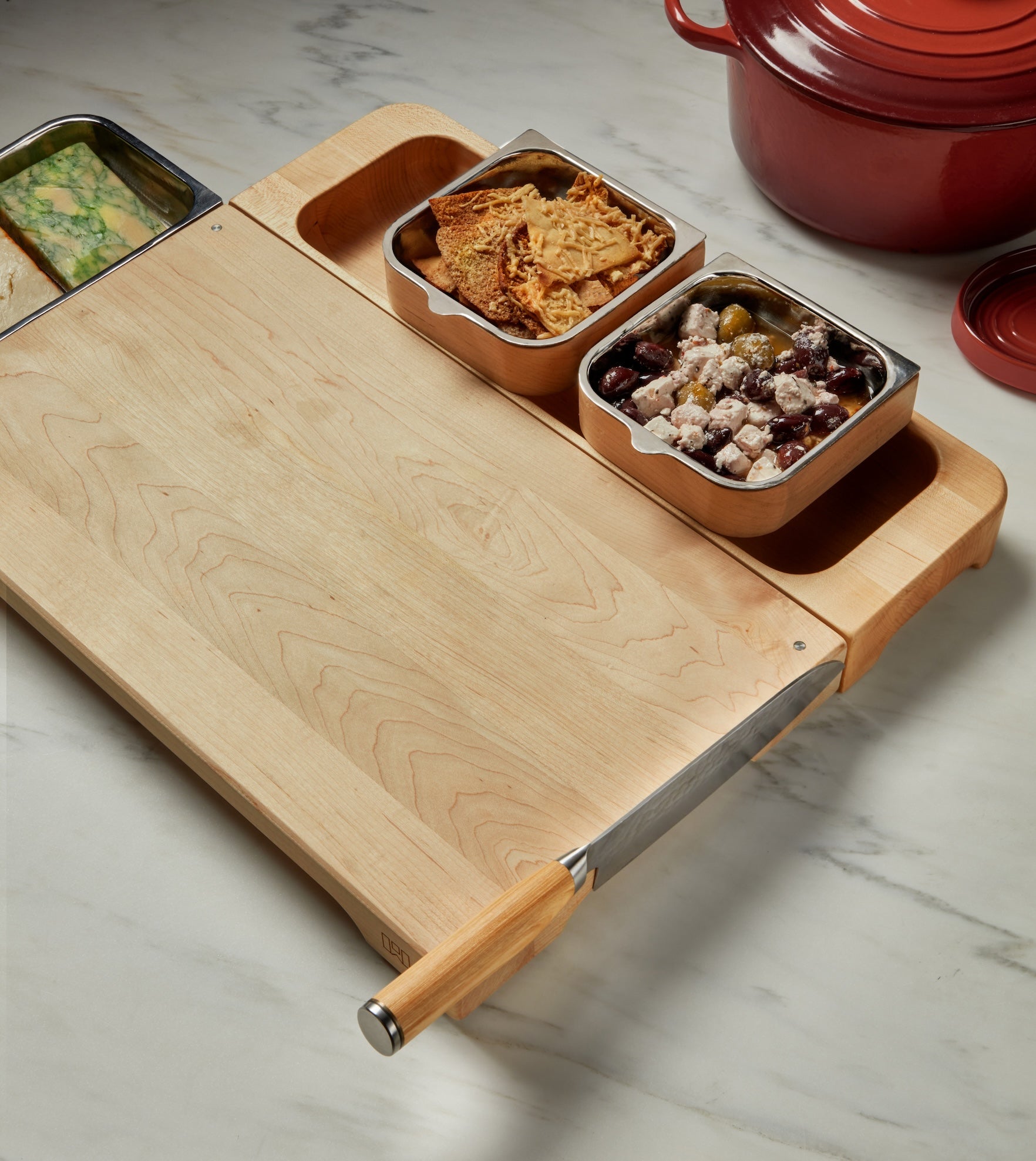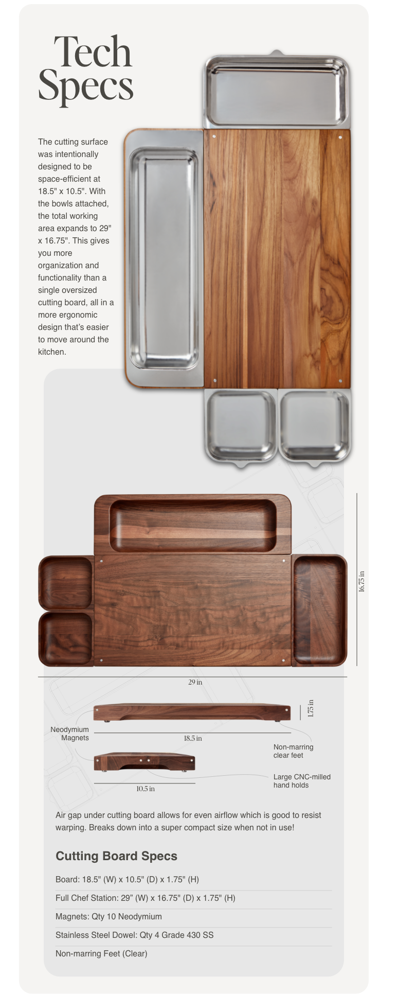 Includes premium hardwood cutting board, magnetic modular collection bowls, oven-safe stainless steel & silicone liners